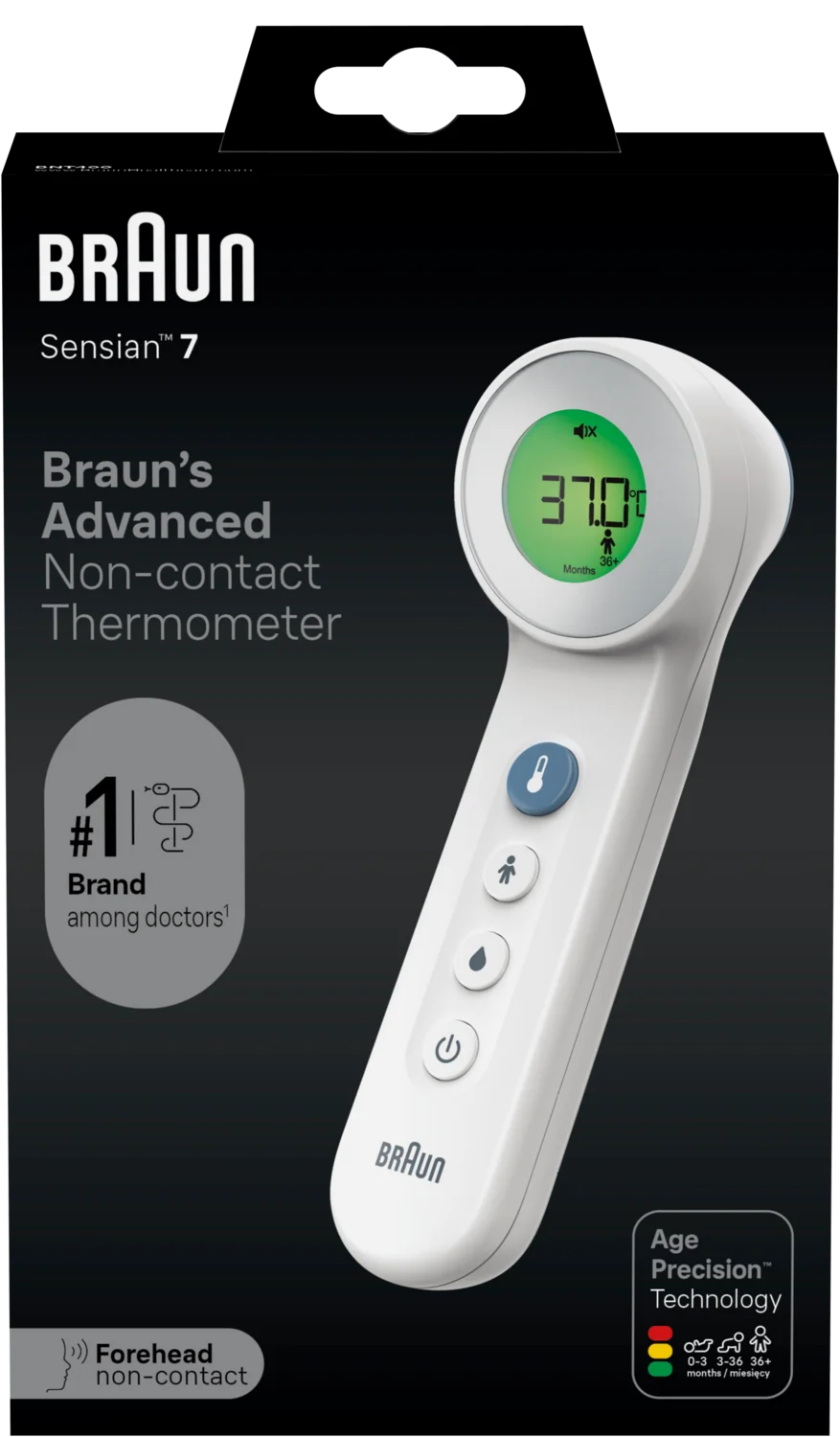 Braun BNT400 je čelni termometer z dvojno tehnologijo merjenja – omogoča tako brezstično kot stično merjenje temperature na čelu. Primeren je za dojenčke, otroke in odrasle ter tudi za merjenje temperature tekočin, hrane in kopeli.