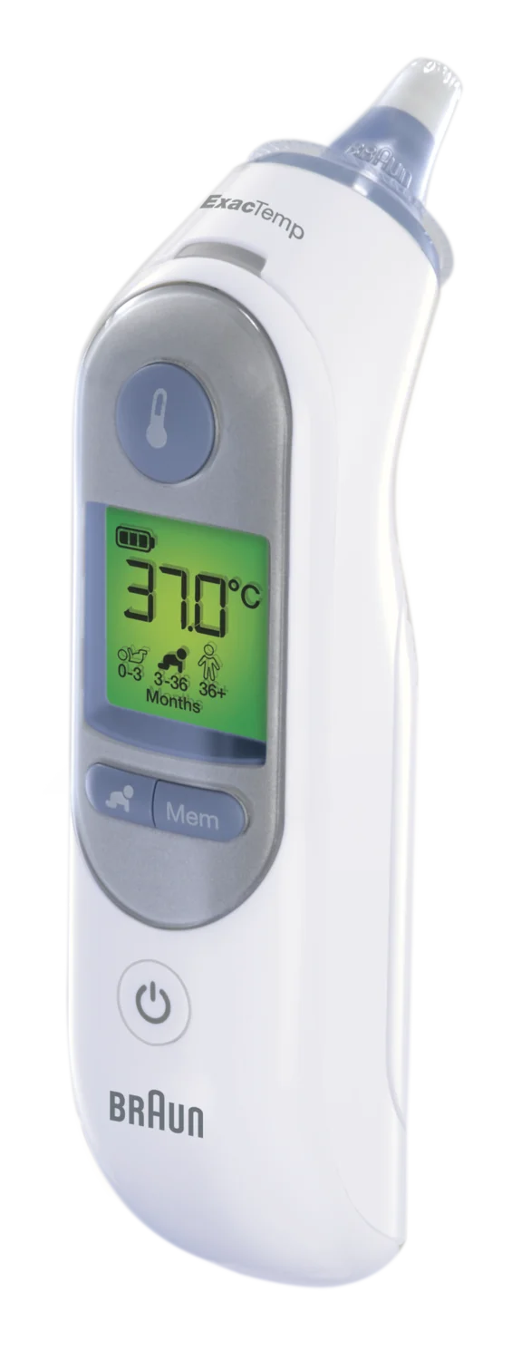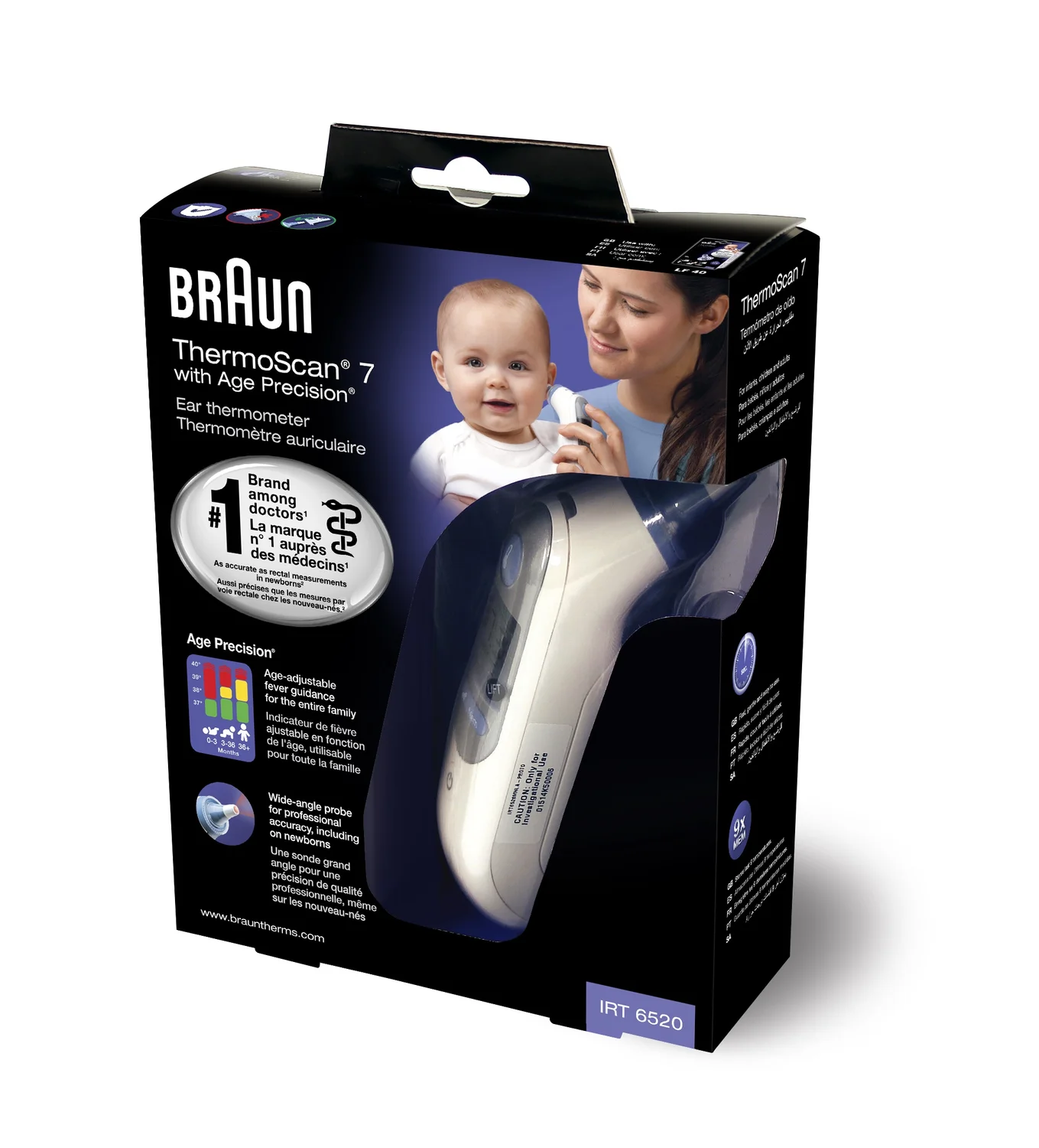 Braun Thermoscan je starosti prilagodljiv ušesni termometer, primeren za vso družino. Meri telesno temperaturo v ušesu z infrardečo tehnologijo ter omogoča hitro in natančno merjenje. Opremljen je s funkcijo Age Precision in barvno kodiranim prikazovalnikom za lažjo interpretacijo rezultatov. Ima ergonomski dizajn, nočno osvetlitev, sistem vodenja ExacTemp ter spominsko funkcijo za shranjevanje do 9 meritev.