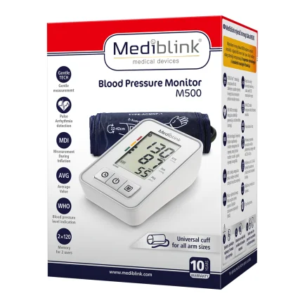 Mediblink merilnik krvnega tlaka M500 je napreden nadlahtni merilnik, namenjen natančnemu merjenju sistoličnega in diastoličnega krvnega tlaka ter srčnega utripa. Opremljen je z velikim LCD zaslonom in lestvico WHO, ki omogoča enostavno razumevanje izmerjenih vrednosti. Merilnik omogoča shranjevanje meritev za dva različna uporabnika, medtem ko ima vsak uporabnik lahko shranjenih 120 meritev. Zaradi naprednih tehnologij in dodatnih funkcij zagotavlja udobno, hitro in zanesljivo merjenje. Priložena je manšeta univerzalne velikosti, primerna za obsege rok od 22 do 42 cm. Priložene so 4x 1.5V AA baterije. Zaslon prikaže simbol za prazne baterije. Vrečka za shranjevanje je priložena. Merilnik ima 10 let garancije, manšeta pa 1 leto.