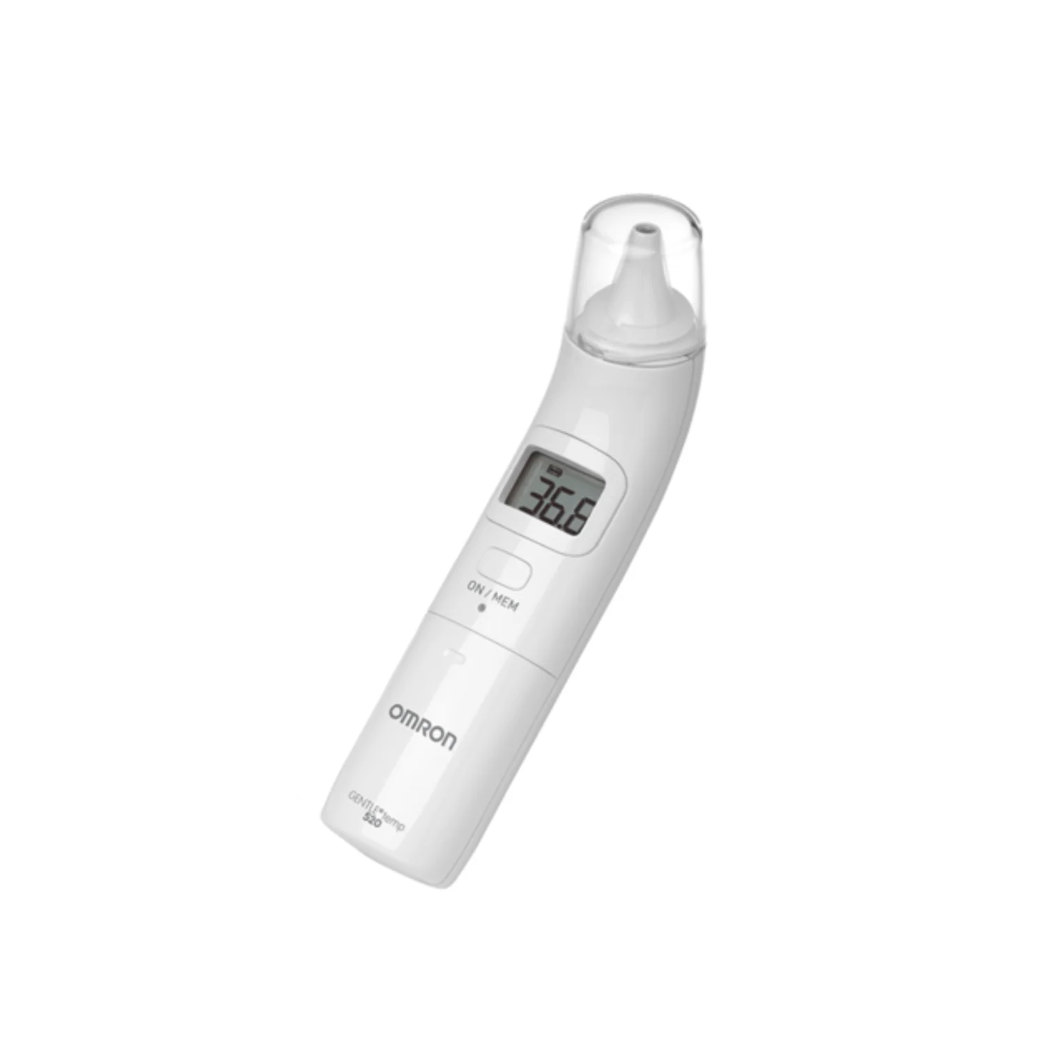 Omron ušesni termometer 520 Gentle Temp omogoča varno, natančno in enostavno merjenje telesne temperature v ušesnem bobniču. Ponuja večje udobje kot rektalno merjenje ter hitrejši in zanesljivejši rezultat kot ustno merjenje. Rezultat prikaže že v 1 sekundi in omogoča shranjevanje do 9 meritev. V pakiranju je priloženih tudi 21 ušesnih nastavkov, ki zagotavljajo higiensko zaščito.