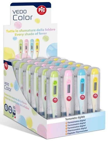 PiC digitalni termometer VedoColor je zanesljiv in klinično testiran elektronski termometer, namenjen hitremu in natančnemu merjenju telesne temperature. Opremljen je s trdo, vodoodporno konico ter zvočnim signalom, ki opozori na povišano telesno temperaturo. Temperaturo izmeri v približno 1 minuti pri oralnem ali rektalnem merjenju ter v 3 minutah pod pazduho.
