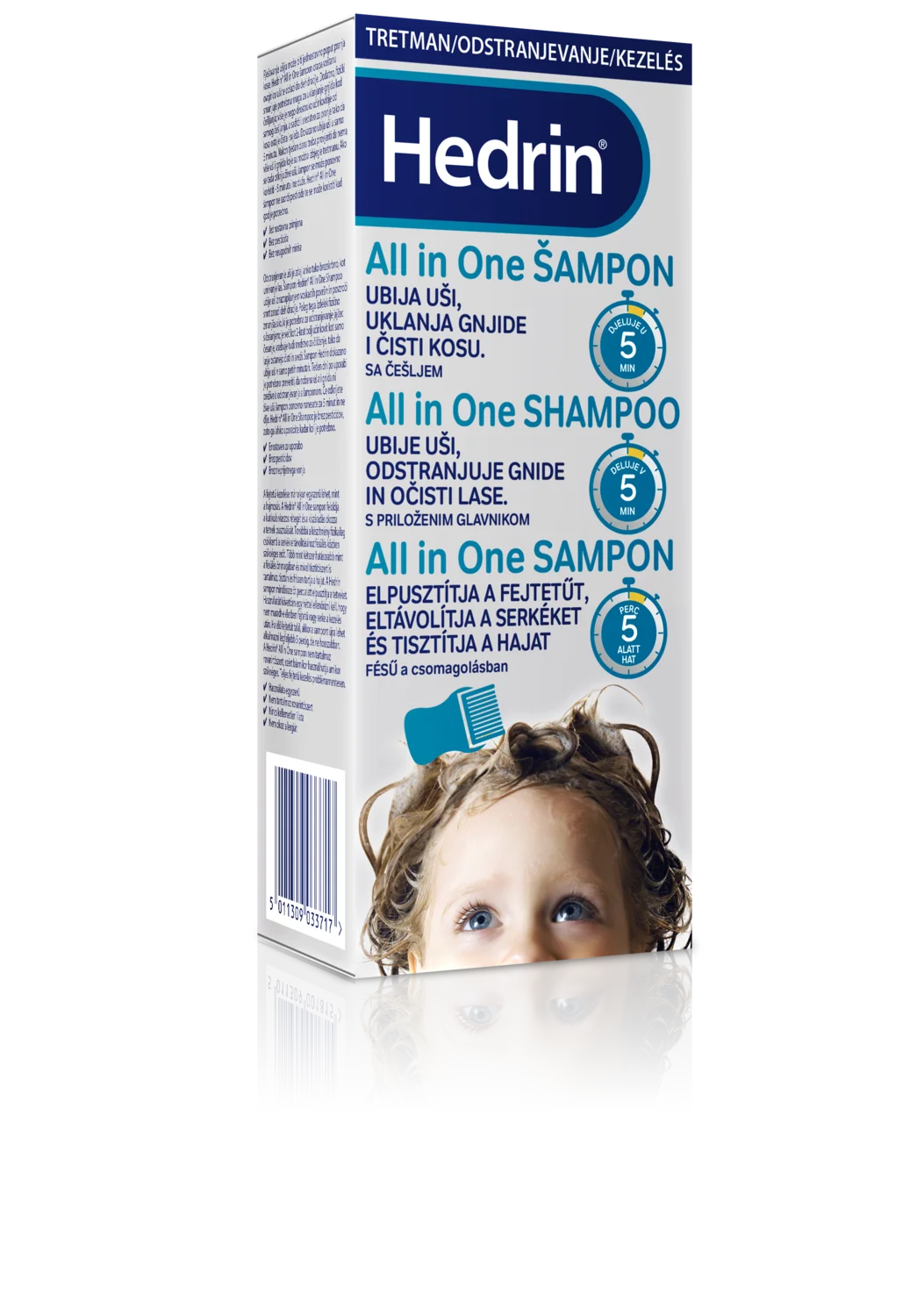 Hedrin All in One je šampon, ki je zasnovan za učinkovito odstranjevanje uši in gnid. Deluje brez pesticidov in ga lahko uporabljate kadarkoli je to potrebno. Šampon ubija uši v samo 5 minutah, hkrati pa lase pusti čiste in sveže, saj vsebuje čistilo. Uši ubije tako, da raztopi voskaste površine, kar vodi v njihovo dehidracijo in smrt. Poleg tega izdelek zmanjša silo, potrebno za odstranjevanje gnid pri česanju, saj je več kot dvakrat bolj učinkovit kot samo česanje. Po uporabi je priporočljivo preveriti lase po enem tednu, da se zagotovi, da ni preostalih živih uši ali gnid, in po potrebi ponoviti nanos.