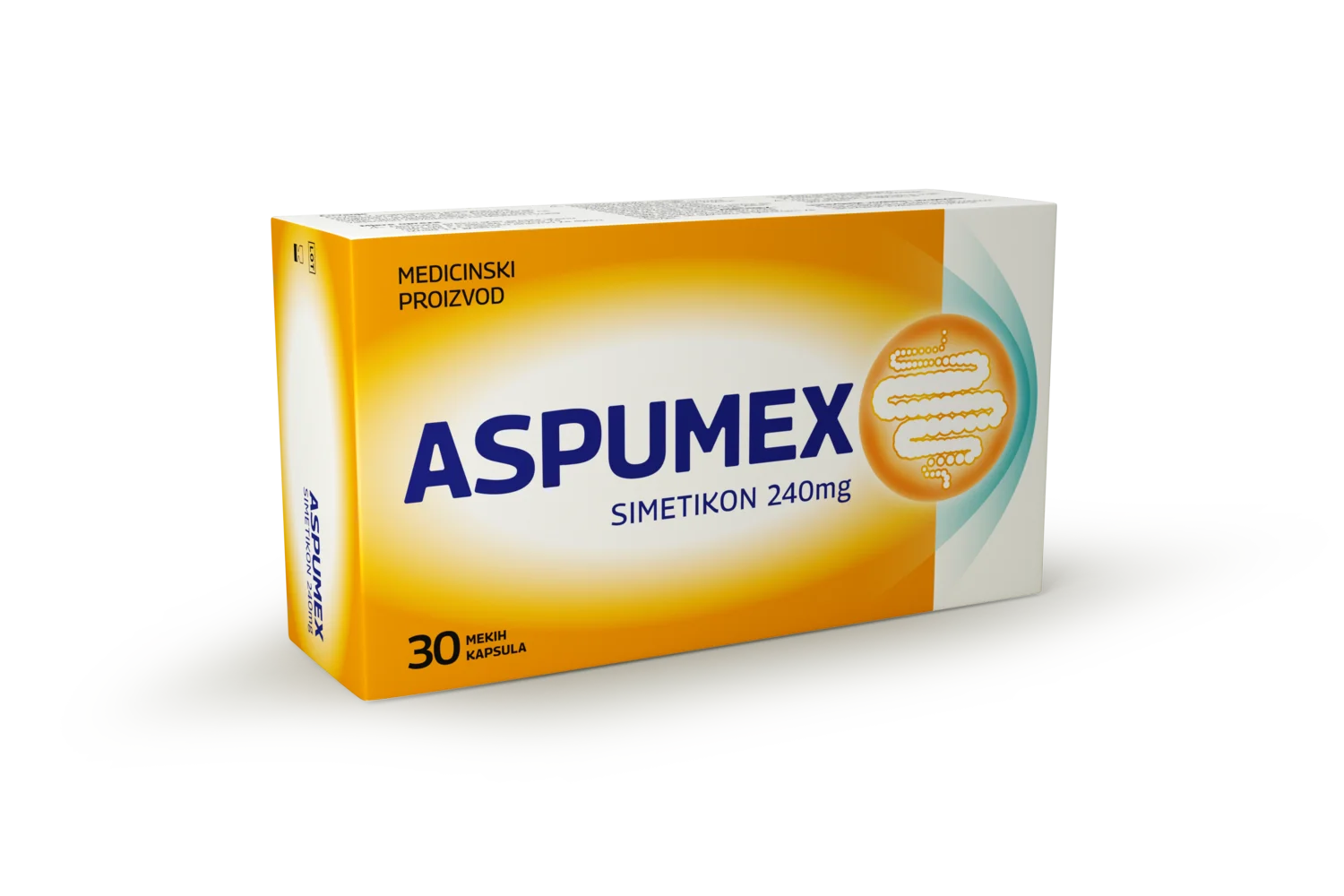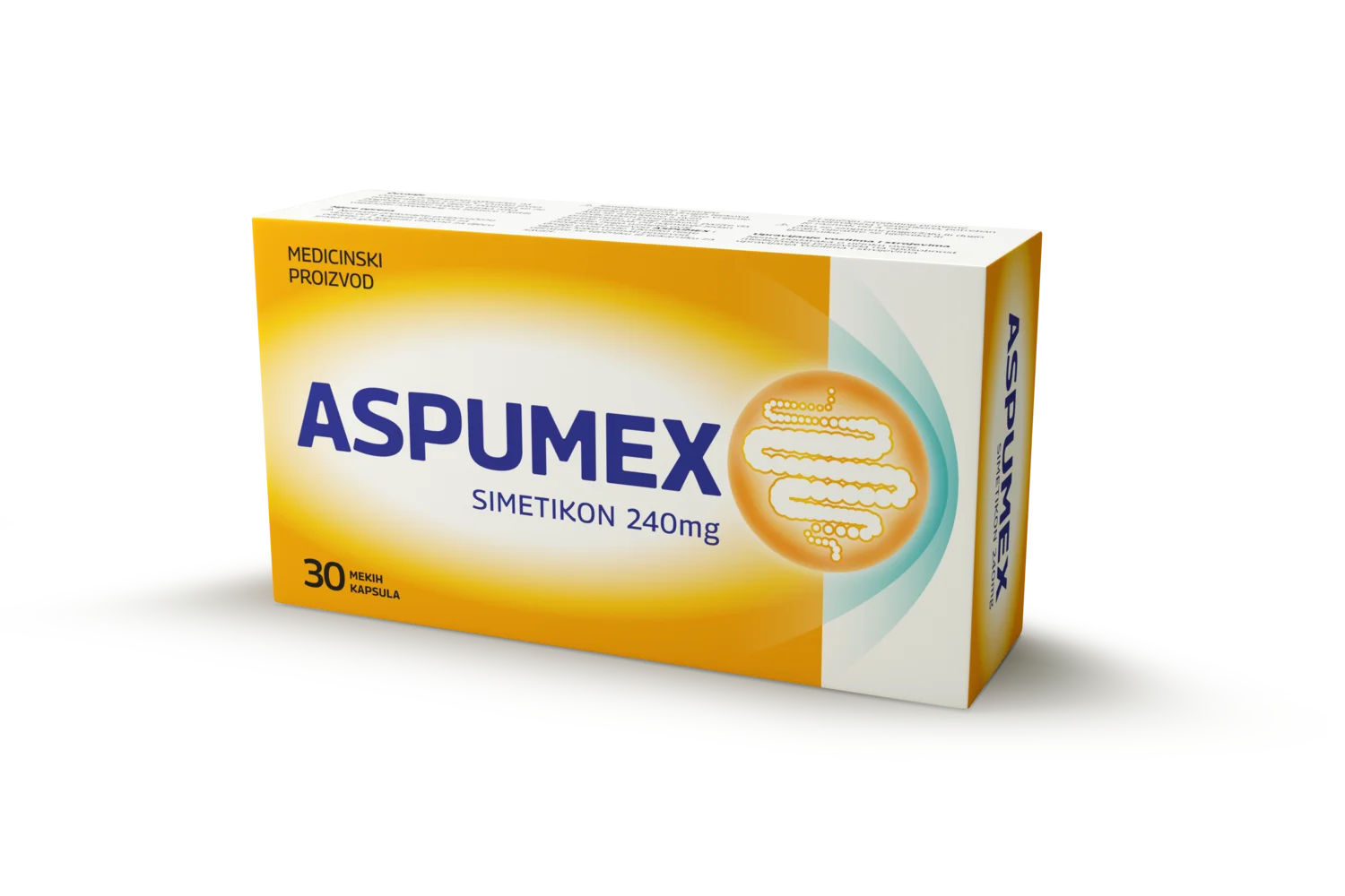 Aspumex je medicinski pripomoček, ki se uporablja za lajšanje občutka polnosti v trebuhu, občutka napihnjenosti, spahovanja, nelagodja, povezanega s čezmernim kopičenjem plinov in zraka v prebavilih, ki povzročajo napetost in stiskanje v črevesju. ASPUMEX zmanjša površinsko napetost mehurčkov plina v črevesju, zaradi česar enostavno popokajo in se izločijo. Simetikon deluje samo na površinsko napetost in ne vstopa v nobene kemične reakcije. Je farmakološko in fiziološko inertna snov.