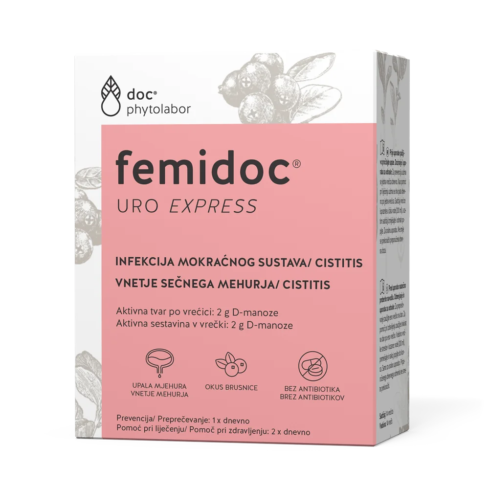 Femidoc Uro Express je prehransko dopolnilo, ki se uporablja za lajšanje simptomov okužb mehurja in sečil, še posebej tistih, ki jih povzroča bakterija E. coli. Vsebuje aktivno sestavino D-manoza, naravni monosaharid, ki se v telesu pojavlja tudi naravno. Ta izdelek je v obliki praška, ki ga je mogoče enostavno raztopiti v vodi, kar olajša njegovo uživanje.