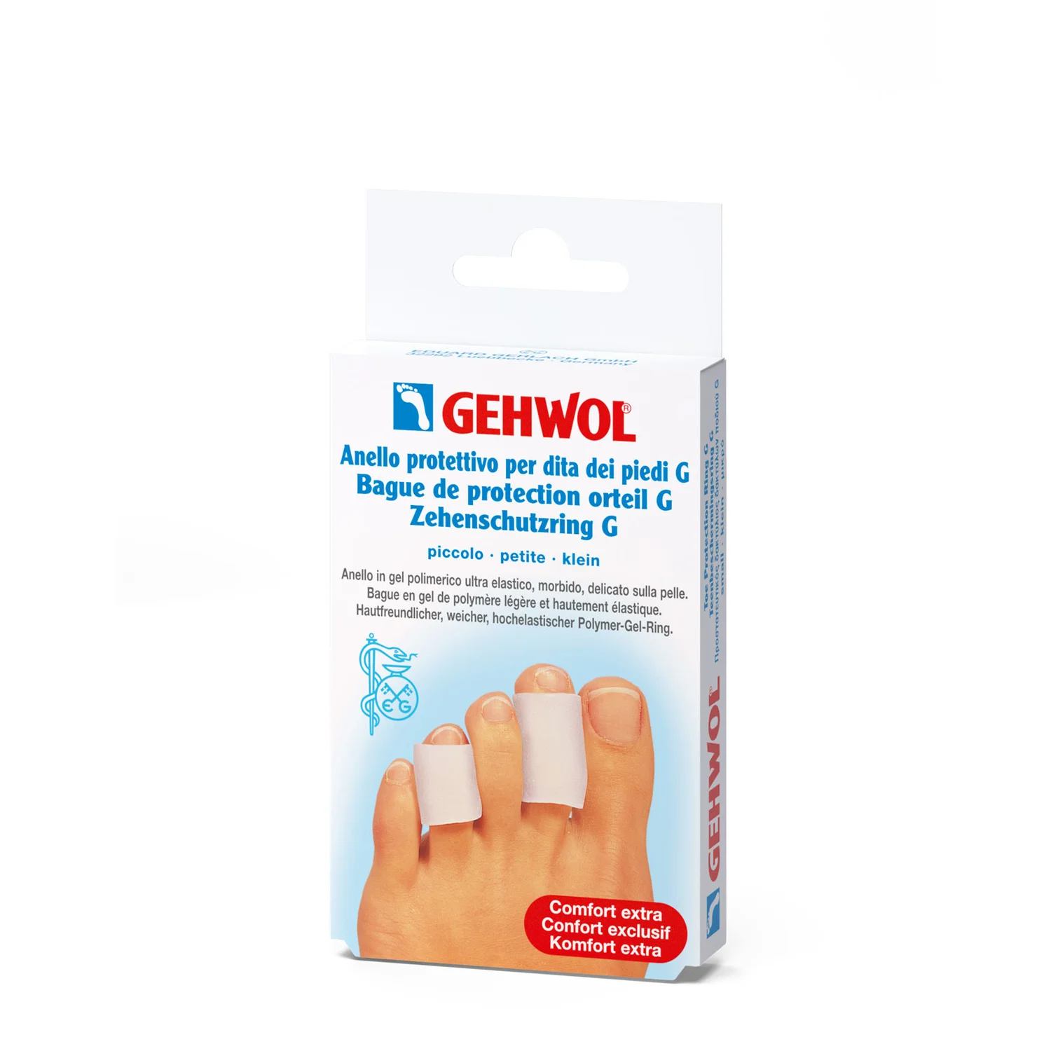 Gehwol zaščitni obroč G za prste je medicinski pripomoček, namenjen enakomerni razbremenitvi pritiska na področjih s kurjimi očesi ali bradavicami. Izdelek je dermatološko preizkušen in je na voljo v štirih velikostih: mini, S - majhen, M - srednji in L - velik.