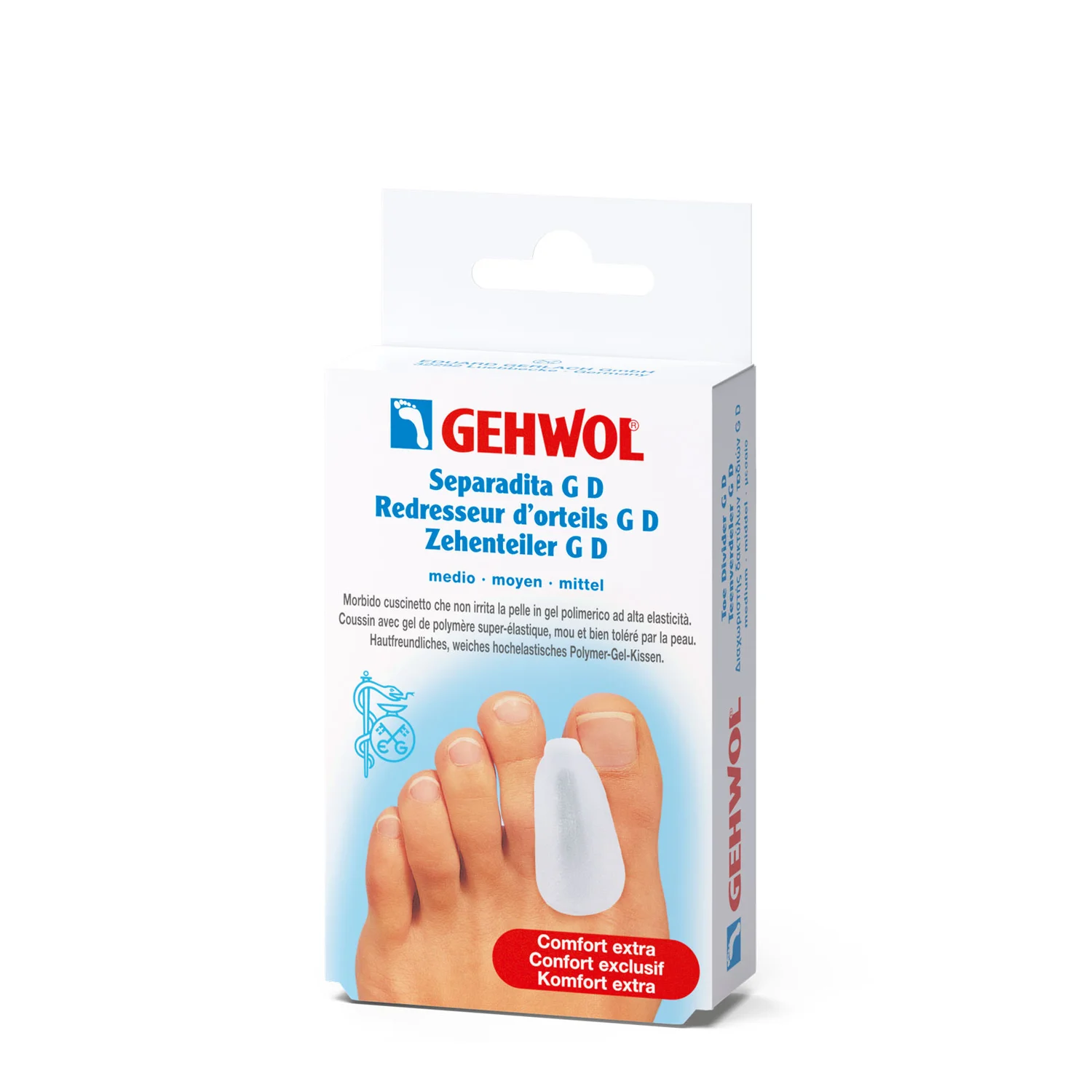 Gehwol razdelilec prstov GD je anatomsko oblikovan medicinski pripomoček s pokrivno strehico, namejen opori tesno skupaj ležečih prstov. Ščiti pred medsebojnim drgnjenjem in olajša nelagodje pri kurjih očesih med prsti. Primeren je tudi za uporabo pri deformiranih prstnih blazinicah. Izdelek je dermatološko preizkušen in na voljo v treh velikostih: S - majhen, M - srednji in L - velik.