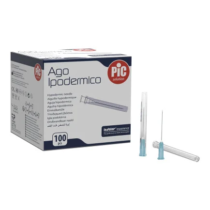 PiC hipodermična igla je sterilna injekcijska igla, namenjena enkratni uporabi. Gre za hipodermalno iglo standardne velikosti G23 (premer 0,6 mm, dolžina 25 mm), ki se uporablja za podkožno, intramuskularno in sklepno aplikacijo. Vsaka igla je posamično pakirana in primerna za različne medicinske postopke, kjer je potrebna natančna in varna penetracija kože. Igle so glede na dimenzijo obarvane po mednarodnem standardu, kar omogoča hitro prepoznavo premera.