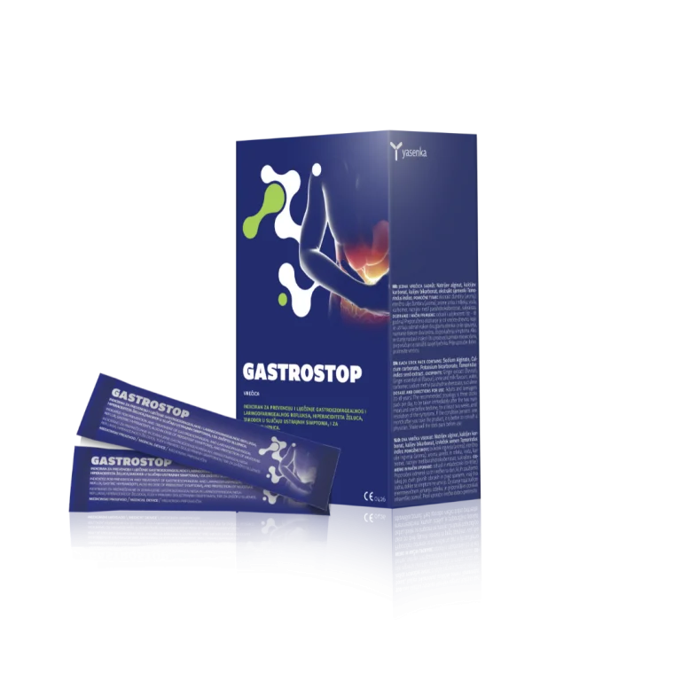 Yasenka Gastrostop je medicinski pripomoček v obliki gela v vrečicah, namenjen zaščiti pred refluksom in prekomerno želodčno kislino. Vsebuje kombinacijo naravnih sestavin, ki tvorijo zaščitno plast na sluznici in zmanjšujejo neprijetne simptome, kot sta zgaga in pekoč občutek v želodcu.