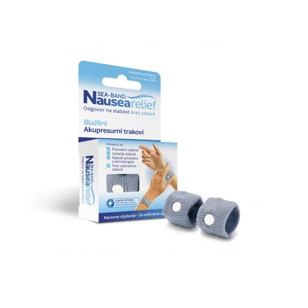 Sea Band akupresurni zapestni trakovi so namenjeni lajšanju različnih oblik slabosti, kot so potovalna in jutranja slabost. Predstavljajo preprosto, varno in naravno rešitev, ki je primerna za širok krog uporabnikov, vključno z odraslimi, otroci, nosečnicami in bolnišničnimi pacienti. Ker ne deluje na osnovi zdravil, ne povzroča stranskih učinkov in se lahko uporablja neomejeno, kadarkoli in kjerkoli.