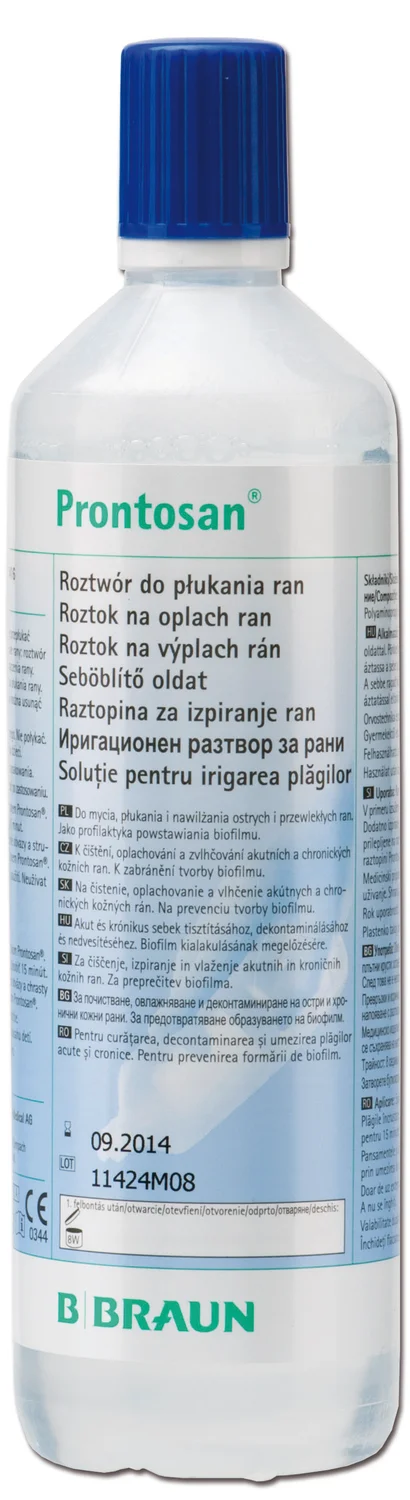 Braun Prontosan vodna raztopina je sterilna raztopina z odličnim čistilnim učinkom, ki pospeši celjenje vseh vrst ran in sluznic, vključno z odrgninami, preležaninami, diabetičnimi in venoznimi razjedami ter kožo okrog stome. Uporablja se za čiščenje, izpiranje, vlaženje in preprečevanje okužb pri poškodbah, opeklinah (1. in 2. stopnje, tudi sončnih), kemičnih ranah ter pri obsevanju.