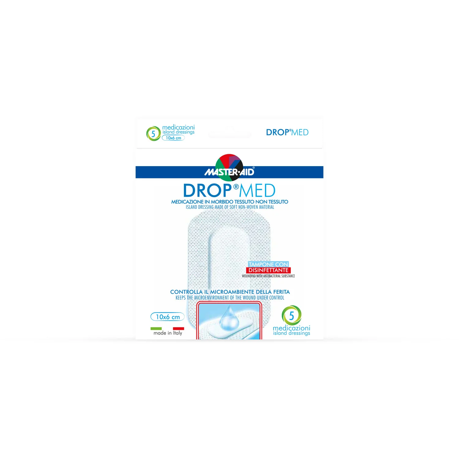 Masteraid Drop Med je mehki in zračni obliž iz netkanega materiala, velikosti 7 x 5 cm. Namenjen je zaščiti ran in vzdrževanju uravnoteženega mikrookolja za hitrejše celjenje.