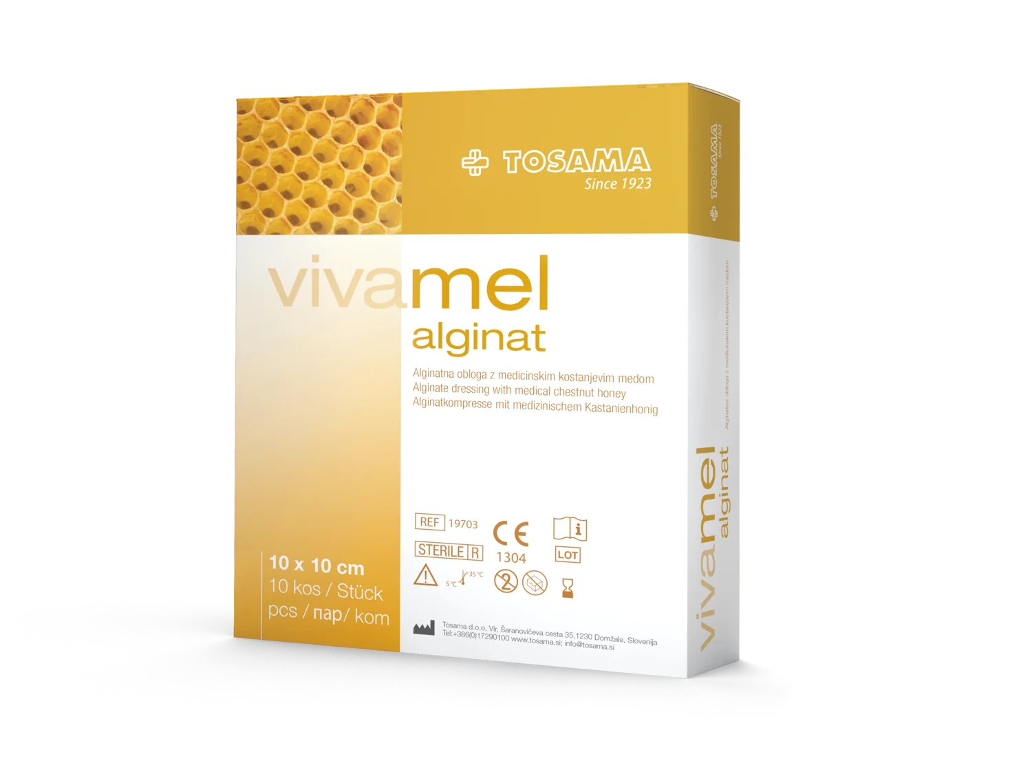 Vivamel sterilna alginatna obloga z medicinskim kostanjevim medom je medicinski pripomoček, namenjen oskrbi ran z zmernim do obilnim izločkom. Zasnovana je za podporo celjenju ran, pri katerih prevladuje vnetni proces, razgradnja in odstranjevanje odmrlega tkiva ter povečano tveganje za bakterijsko obremenitev. Oblogo odlikuje kombinacija naravnega medicinskega medu in kalcijevega alginata, ki ustvarjata optimalne pogoje za vlažno celjenje in lažjo oskrbo rane. Izdelek je na voljo v 2 dimenzijah: 5 x 5 cm in 10 x 10 cm.