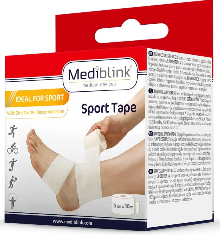 Mediblink bandažni trak M139 se uporablja za povijanje manjših in večjih sklepov pri športnih aktivnostih. Lepilo na osnovi cinkovega oksida zagotavlja dolgotrajen oprijem, saj je odporen na premike in vlečenje. Nazobčan rob omogoča enostavno ročno trganje po namestitvi brez dodatnih orodij. Mere: 5 cm x 10 m.