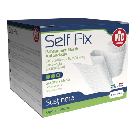 PiC Self Fix je elastični samolepljivi povoj za pritrditev sanitetnega materiala ali nežno oporo pri manjših poškodbah, kot so zvini in udarnine. Povoj se zaradi majhnih delcev lateksa lepi sam nase, ne sprijema pa se s kožo ali dlako, kar omogoča enostavno in nebolečo uporabo brez dodatnih pripomočkov, kot so sponke ali obliži. Izdelek je na voljo v več različnih dimenzijah.
