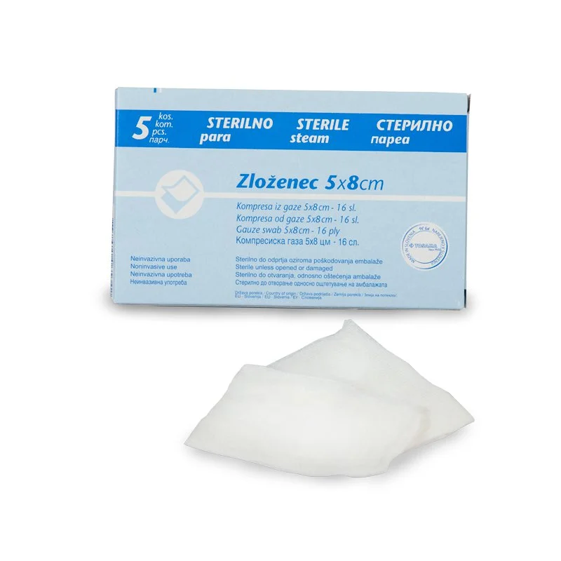 Zloženec je velikosti 5x8cm in je sterilen. Zloženci so mehke, zložene, 16-slojne komprese iz bombažne beljene gaze, posamično pakirane in sterilizirane. Uporabljajo se za čiščenje ran, kot obloge za rane ter v higienske namene.