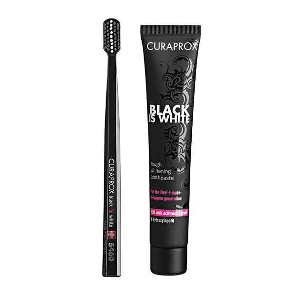 Curaprox Black is White je inovativna zobna pasta z aktivnim ogljikom, ki nežno pobeli zobe brez škodljivih belil ali abrazivov. Paket vključuje tudi vrhunsko zobno ščetko Curaprox s 5460 izjemno mehkimi vlakni Curen, ki poskrbijo za temeljito, a nežno čiščenje. Zaradi izredno finih vlaken zobna ščetka doseže tudi težko dostopna mesta in učinkovito odstrani obloge, ne da bi dražila dlesni.