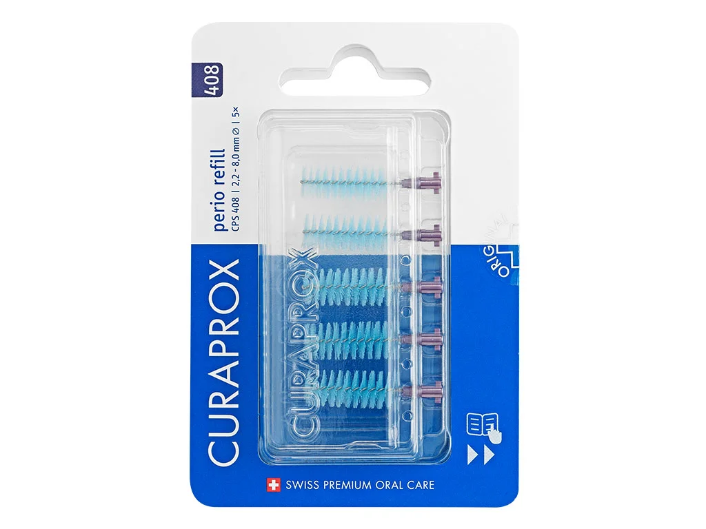 Curaprox CPS 408 Perio refill je komplet petih rezervnih medzobnih ščetk, zasnovanih za temeljito in nežno čiščenje večjih medzobnih prostorov ter izpostavljenih območij med zobmi. Zaradi izjemno dolgih, finih in mehkih ščetin omogočajo učinkovito odstranjevanje zobnih oblog brez bolečin, kar je posebej pomembno pri občutljivih dlesnih ali po parodontalnem zdravljenju. Ščetke so del okolju prijaznega sistema z univerzalnim klik mehanizmom, ki omogoča uporabo z vsemi Curaprox ročaji, eko pakiranje pa prispeva k zmanjšanju plastičnih odpadkov. Premer žice je 1,0 mm, ščetke pa 8 mm, kar jih naredi idealne za čiščenje večjih medzobnih prostorov.