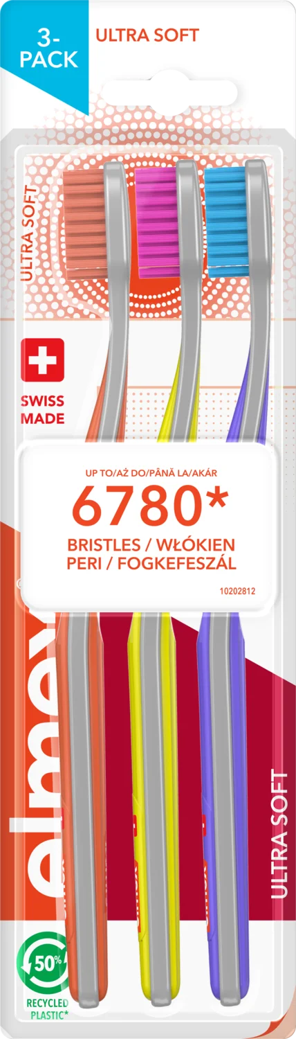 Elmex zobna ščetka ultra soft je zasnovana za nežno, vendar učinkovito vsakodnevno ćiščenje zob in dlesni. Majhna, kompaktna glava omogoča lažji dostop tudi do težje dosegljivih mest. Izjemno mehke ščetine s premerom 0,1 mm omogočajo nežno čiščenje ter pomagajo pri odstranjevanju bakterijskih oblog, površinskih madežev in preprečevanju razvoja kariesa. Pakiranje vsebuje tri ščetke, primerno za celotno družino.