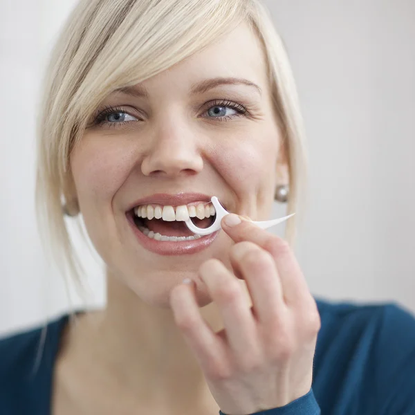 - Vsebuje zobno nitko na držalu, ki omogoča enostavno čiščenje medzobnih prostorov.