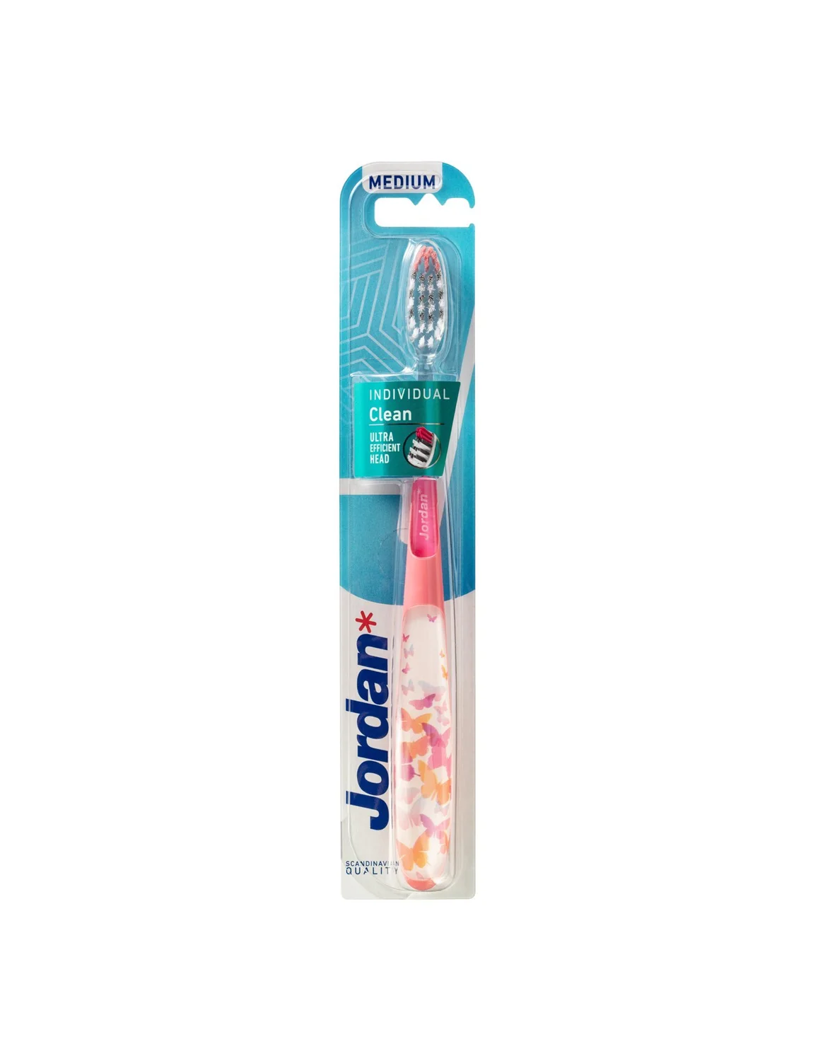 Jordan Individual Clean je zobna ščetka s srednje veliko glavo in ergonomskim držalom, ki omogoča boljši nadzor nad gibanjem ščetke, natančno čiščenje zob in udobnejšo uporabo. Aktivna konica in ščetine Pedex Spiral Magic zagotavljajo visoko učinkovitost čiščenja, tudi na težje dostopnih mestih. Ščetka je namenjena uporabnikom s trdnim oprijemom, ki ščetkajo temeljito in močno pritiskajo. Zobna ščetka je na voljo z mehkimi in srednje trdimi ščetinami.