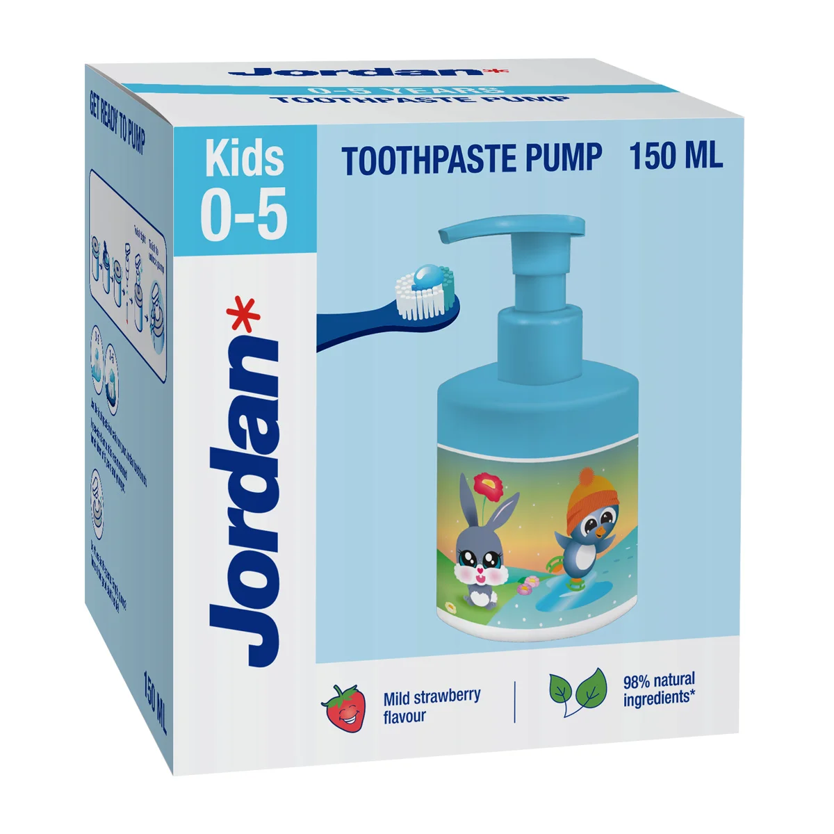 Jordan Kids zobna pasta je namenjena otrokom od 0 do 5 let in zagotavlja nežno nego občutljivih mlečnih zob. Formula vsebuje 1000 ppm fluorida, ki zaščiti pred zobno gnilobo, ter ne vsebuje SLS in je sestavljena iz 98 % naravnih sestavin. Na voljo je v priročni embalaži s pumpico, ki omogoča enostavno, zabavno in natančno odmerjanje z enim pritiskom. Pasta ima blag sadni okus jagode, ki je prijeten otrokom ter je brez dodanega sladkorja.