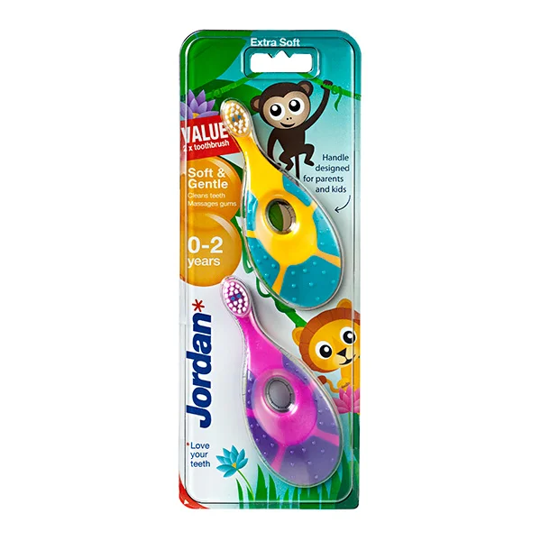 Jordan Step 1 zobna ščetka je posebej zasnovana za otroke od 0 do 2 let ter omogoča varno, prijetno in nežno prvo izkušnjo čiščenja zob. Ima izjemno mehke ščetine za nežno čiščenje mlečnih zob, mehek gumjasti obroček za žvečenje in kratek vrat, ki preprečuje pregloboko vstopanje v otrokova usta. Držalo je primerno tako za majhne otroške roke kot za roke odraslih, kar staršem omogoča, da otroku pomagajo pri ščetkanju in ga postopoma učijo pravilne ustne nege. Barvna vlakna na sredini glave pomagajo pri odmerjanju ustrezne količine zobne paste.