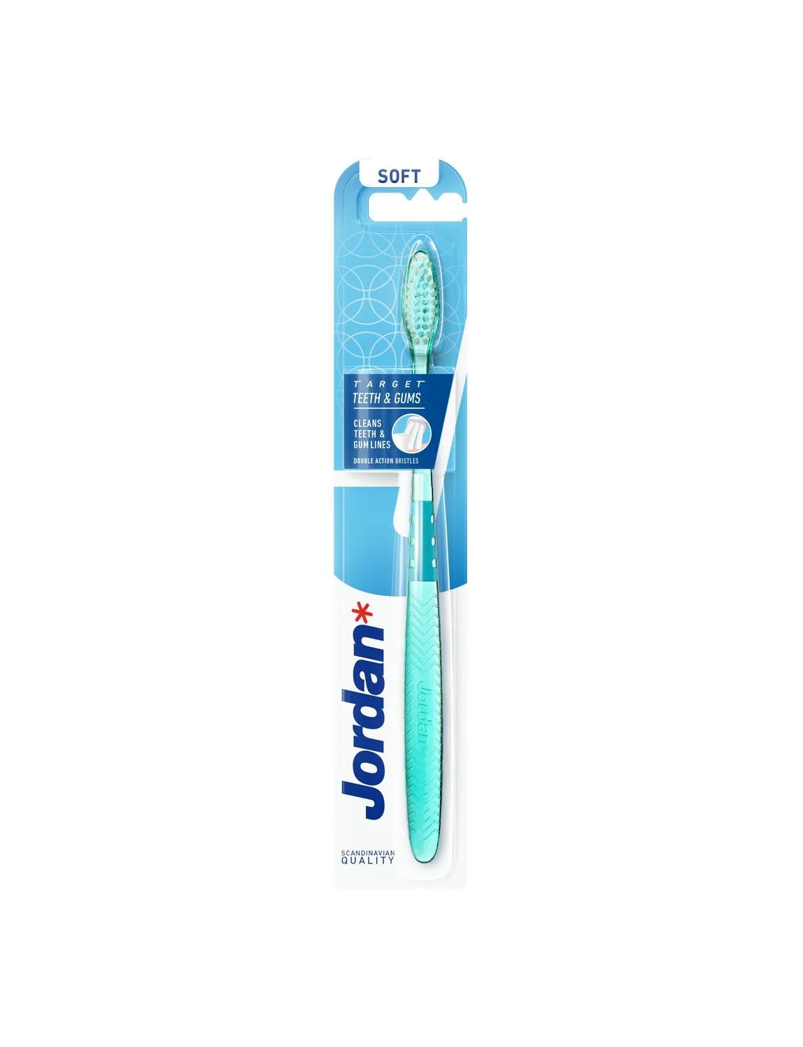 Jordan Target Teeth & Gums zobna ščetka ima srednje veliko glavo in dve vrsti ščetin, ki omogočata nežno čiščenje roba dlesni ter učinkovito čiščenje težje dostopnih mest v ustni votlini. Aktivna konica pripomore k odstranjevanju zobnih oblog, tanko in ergonomsko držalo pa omogoča boljši nadzor nad gibanjem ščetke ter spodbuja manjši pritisk med ščetkanjem. Zobna ščetka je na voljo z mehkimi in srednje trdimi ščetinami.