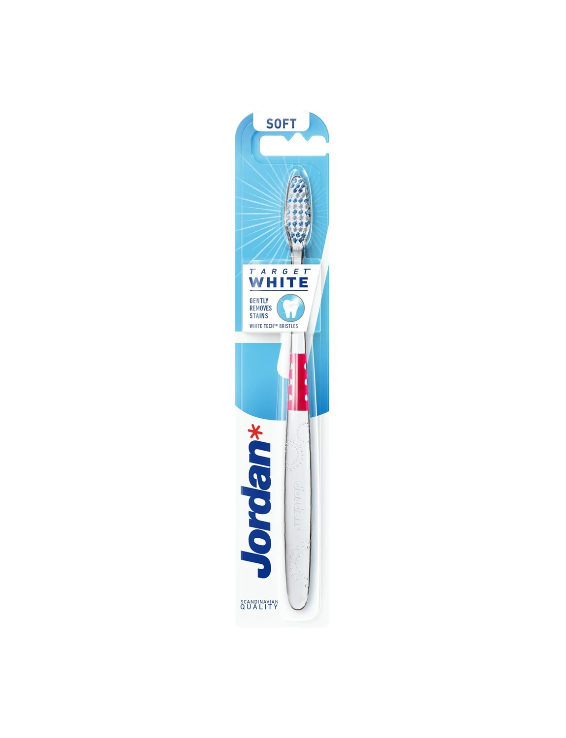 Jordan Target White zobna ščetka ima srednje veliko glavo in aktivno konico, ki omogoča učinkovito odstranjevanje vsakodnevnih madežev ter pripomore k ohranjanju naravne beline zob. Tanko in ergonomsko držalo omogoča dober nadzor nad gibanjem ščetke ter spodbuja manjši pritisk med ščetkanjem, kar prispeva k udobni in nežni negi celotne ustne votline. Zobna ščetka je na voljo z mehkimi in srednje trdimi ščetinami.