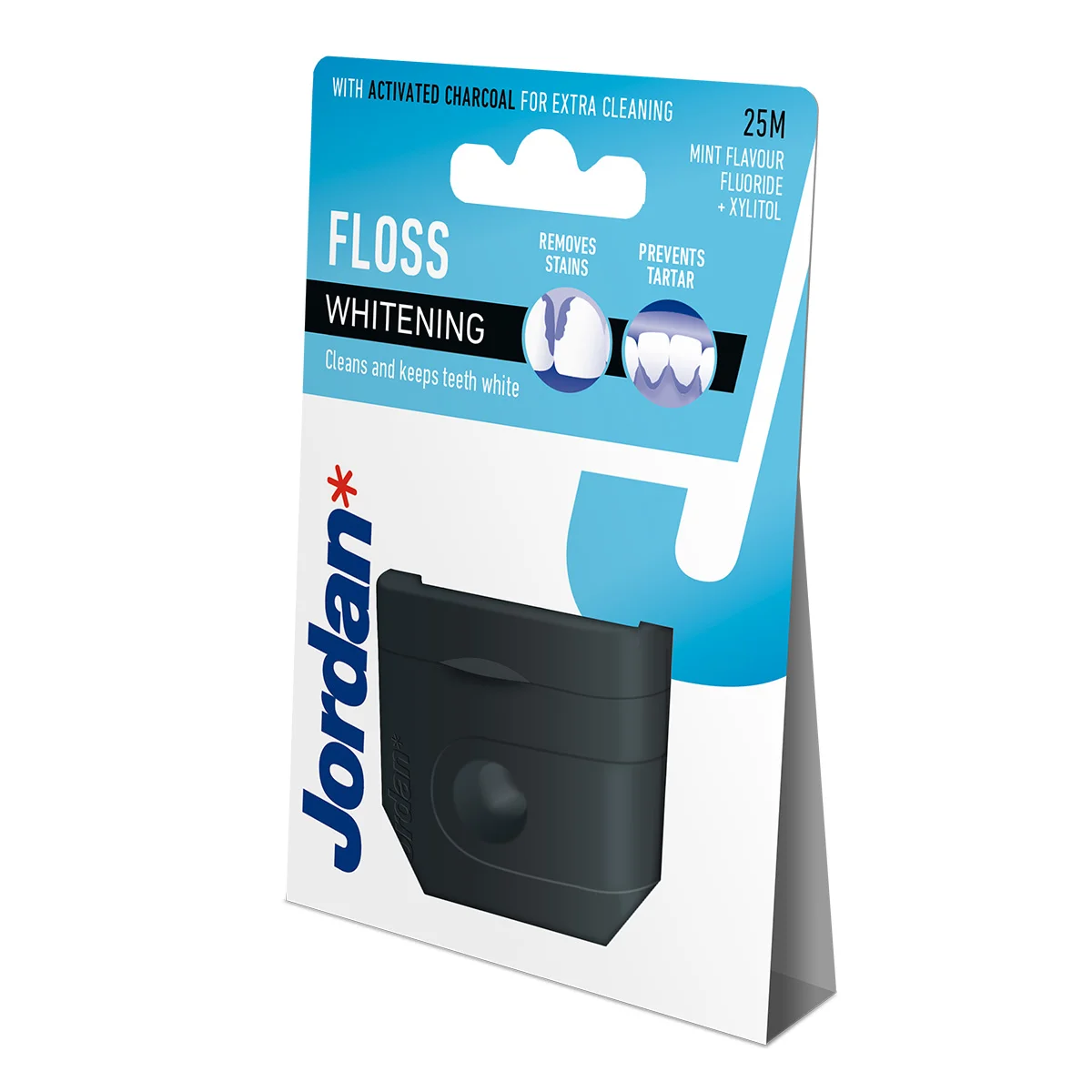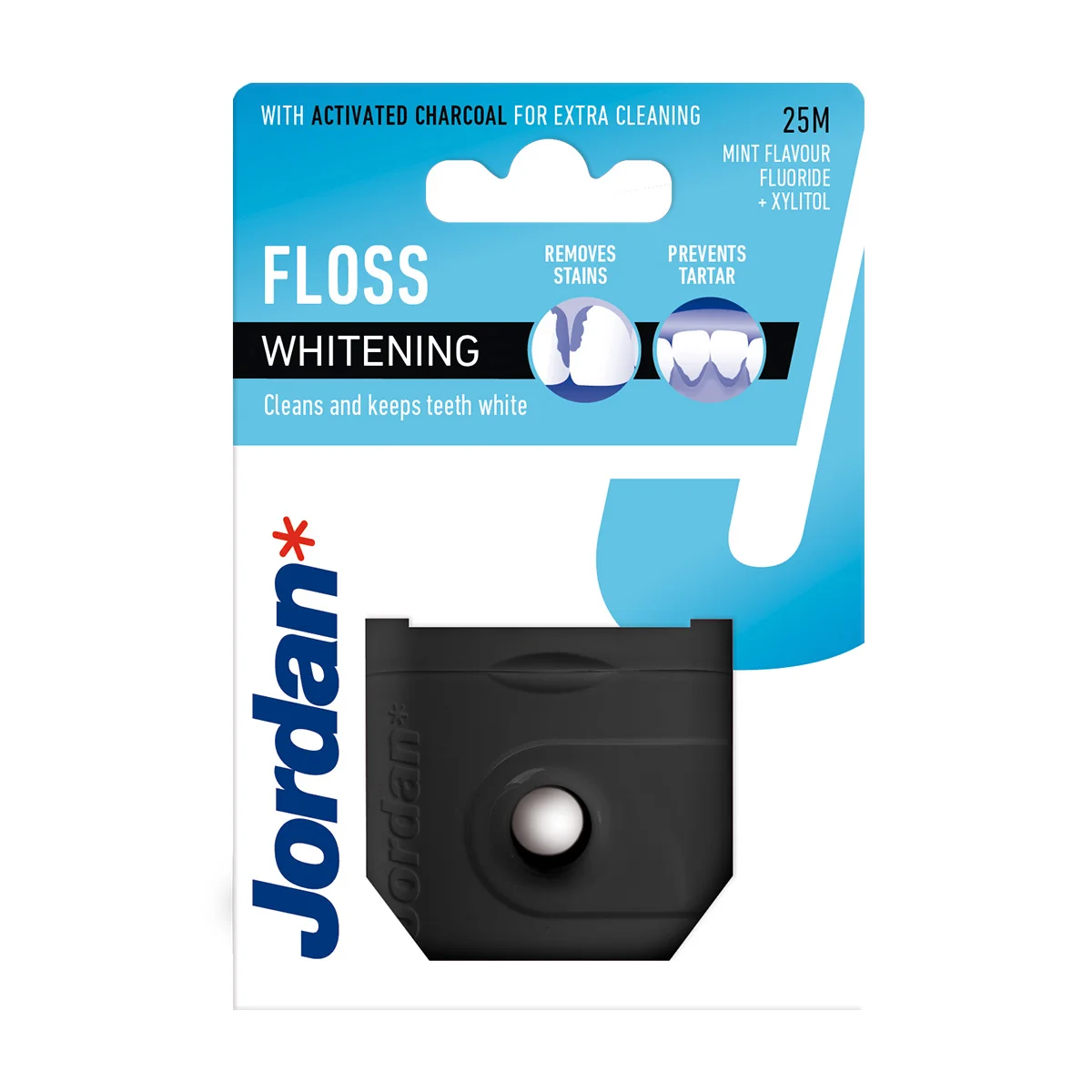 Jordan Whitening zobna nitka je zasnovana za temeljito čiščenje medzobnih prostorov in ob robu dlesni. Nitka je prevlečena s svežim okusom mete ter z aktivnim ogljem, flouridom in ksilitolom, ki pomagajo preprečiti razbarvanje in zobni kamen ter ob redni uporabi ščitijo pred razvojem kariesa. Primerna je za srednje velike medzobne prostore in za ljudi, ki pogosto uživajo kavo, čaj ali sadne sokove. Na voljo je v 25-metrskem navitju ter ne vsebuje PFAS.