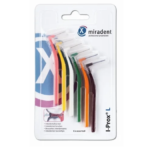 Miradent I-Prox L set medzobnih ščetk različnih velikosti za odstranjevanje nečistoč in ostankov hrane iz težje dostopnih mest med zobmi. Podaljšan ročaj v obliki črke L in 100° kot omogočata enostavno uporabo, vsaka ščetka ima svoj pokrovček. Idealne so tudi za uporabo na poti.