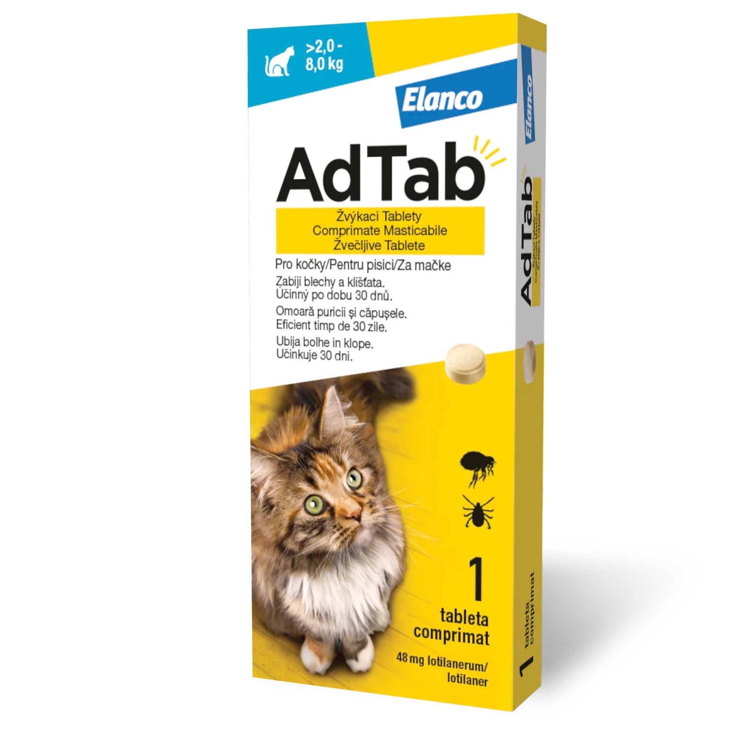 AdTab 48 mg, žvečljive tablete za mačke (2-8 kg), 1 tableta